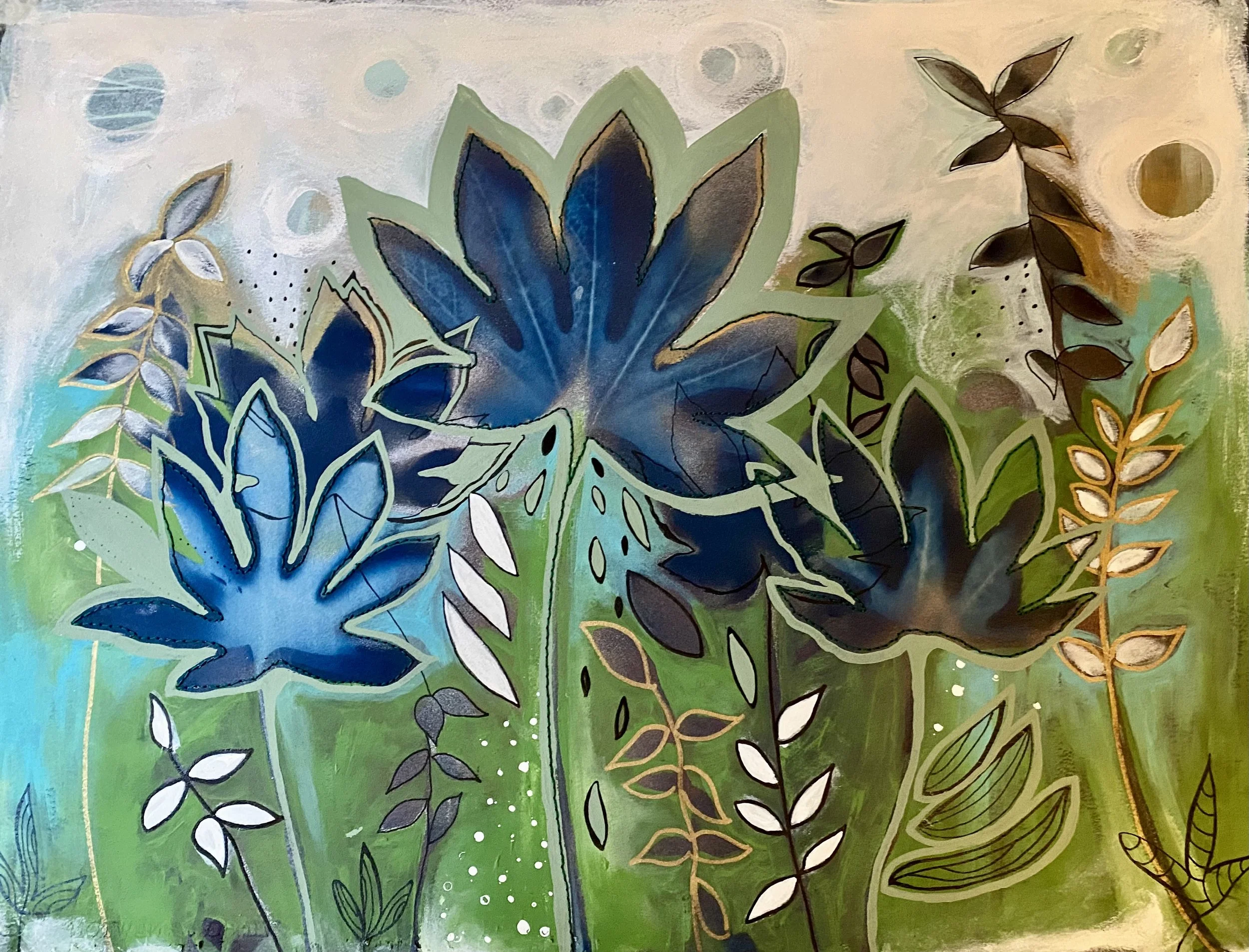 Cyanotype, Acrylic, and Embroidery on Paper